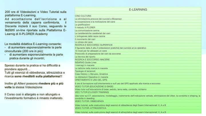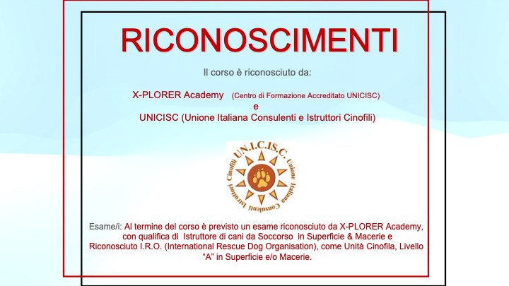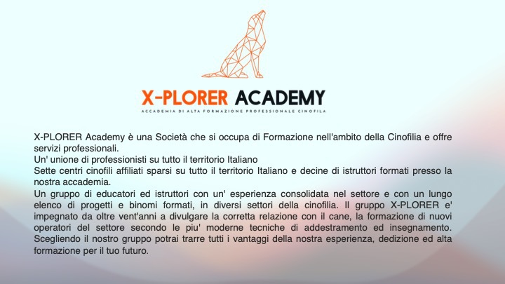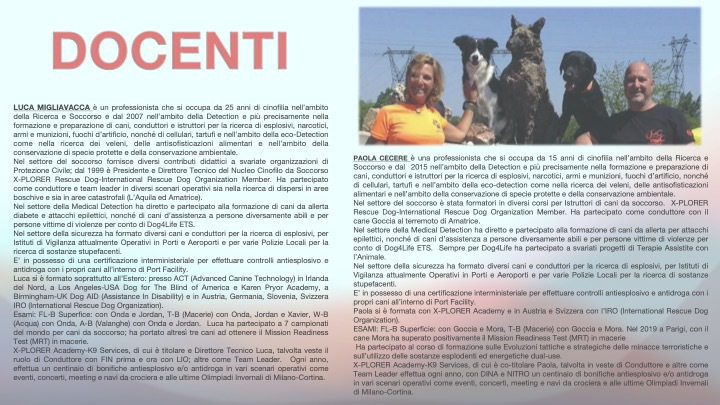 Da sempre X-PLORER mira all'alta formazione. Il soccorso e' una professione a servizio della comunita' e di chi si trova in difficolta'. Ecco perche' gli istruttori sono altamente qualificati. Apprendendo le piu' moderne tecniche di training internazionali per formare un binomio efficace.
